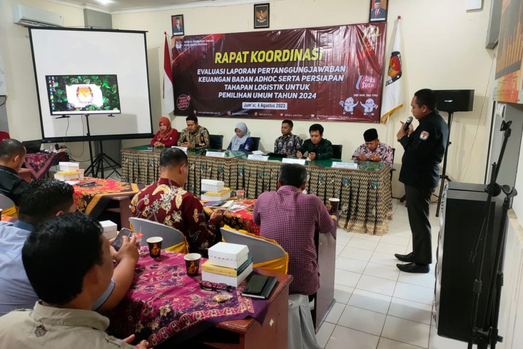 Suasana rakor evaluasi laporan pertanggungjawaban keuangan badan adhoc serta persiapan tahapan logistik Pemilu Tahun 2024 di RPP KPU Pacitan.