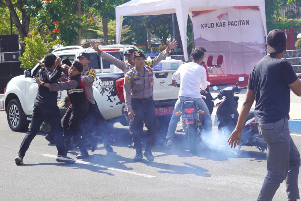 Acara yang dipusatkan di depan kantor Bupati Pacitan ini, benar-benar bikin wow! Ada beberapa simulasi potensi gangguan tahapan Pemilu Tahun 2024 yang diperagakan. Mulai dari potensi gangguan distribusi logistik, kampanye, pemungutan suara, hingga penetapan hasil. Mulai dari potensi bencana alam, hingga kerusuhan yang melibatkan massa atau demonstrasi. Di sesi penetapan hasil ini bahkan diperagakan adanya potensi penculikan komisioner KPU Pacitan yang berhasil secara sigap ditangkap pelakunya oleh jajaran Polres Pacitan.