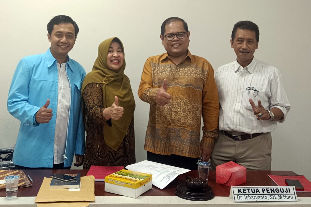 Ujian ini bagi saya cukup menegangkan. Berlangsung kurang lebih 2 jam nonstop. Saat itu, ibunda dan adik saya, menunggu di luar ruangan. Memberi support penuh untuk ujian akhir saya ini. Ujian berakhir dengan prosesi yudisium. Dengan jatuhnya keputusan dari para penguji bahwa saya dinyatakan: lulus! Allahuakbar! Alhamdulillah! Perjalanan menempuh pendidikan di S2 MIH UNS, akhirnya berakhir.