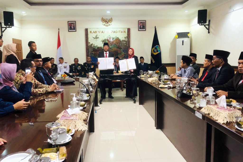 Prosesi penandatanganan naskah NPHD oleh bupati Pacitan dan ketua KPU Pacitan.